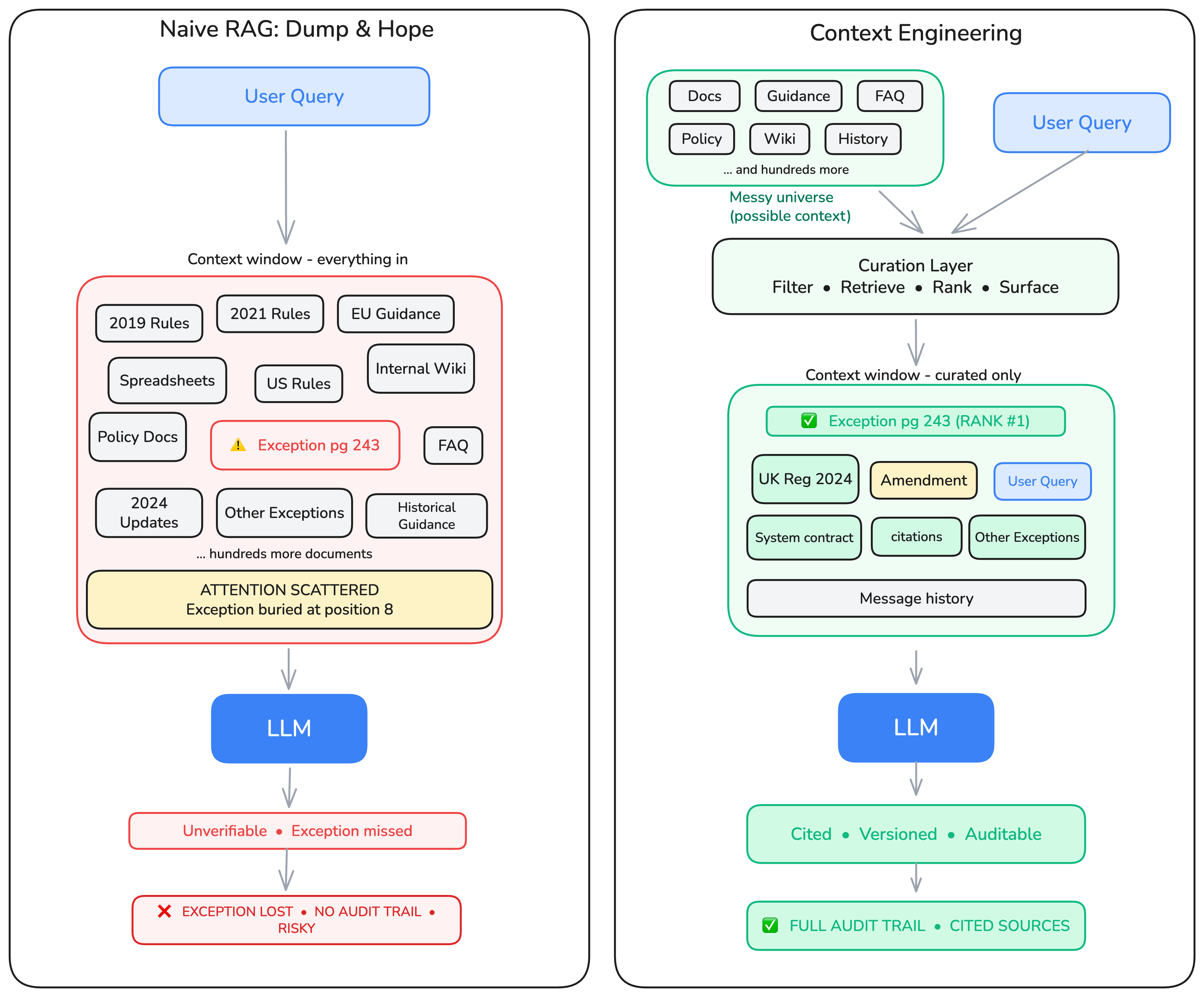 In compliance, this framing matters enormously. What does "100%" actually mean here? It means decisions must be defensible, reasoning must be traceable to evidence, exceptions must be systematically surfaced, and unknowns must be escalated rather than guessed at. None of those properties come from a better prompt. They come from a better-engineered context.